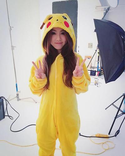 照片中,邓紫棋穿着黄色的皮卡丘衣服,露出可爱的酒窝,非常萌。