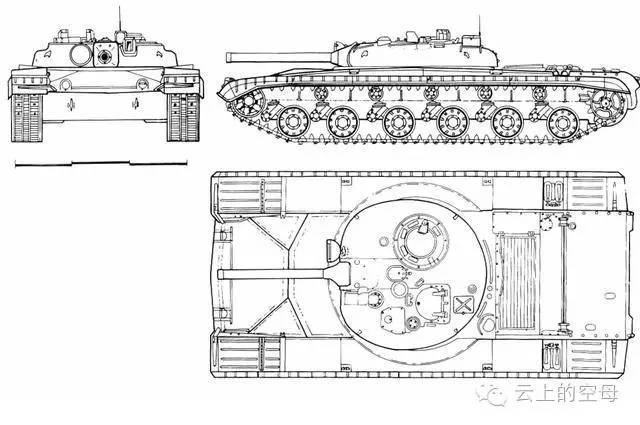 该型坦克的三视图,炮塔采用整体铸造方式,车身比较低矮,减小了被弹区域。