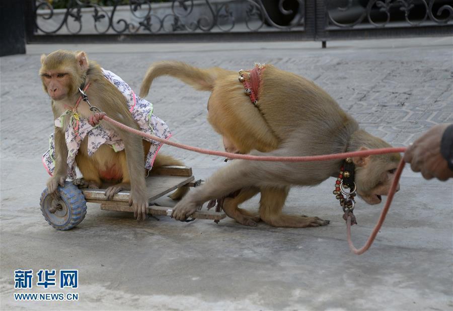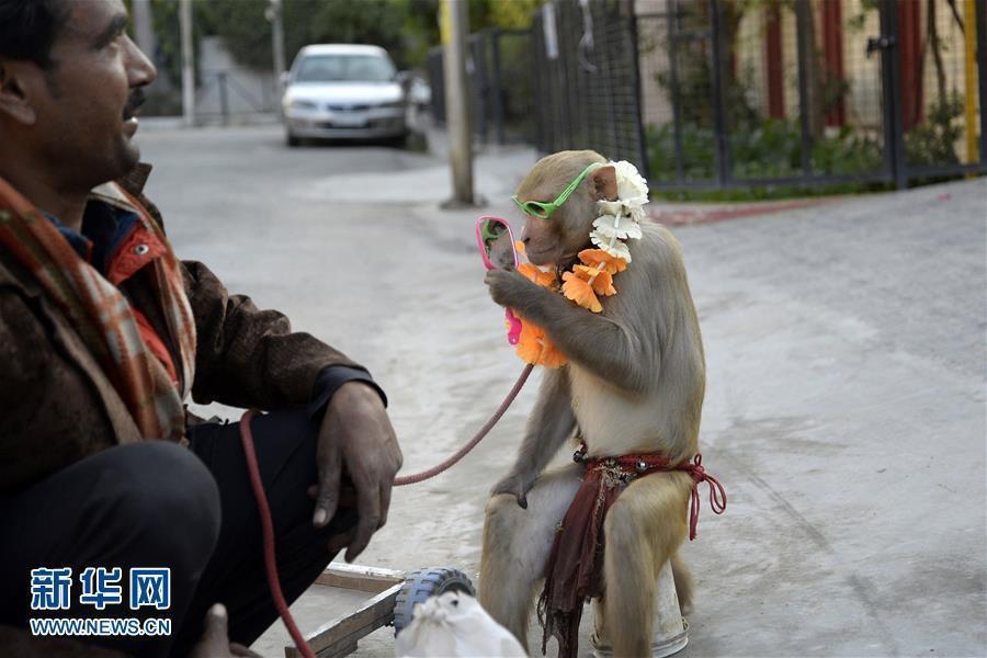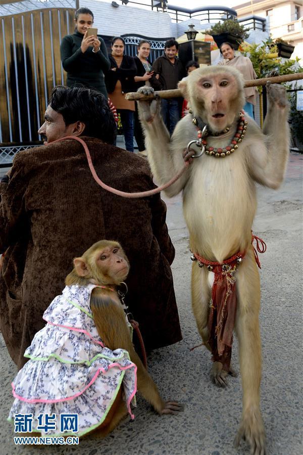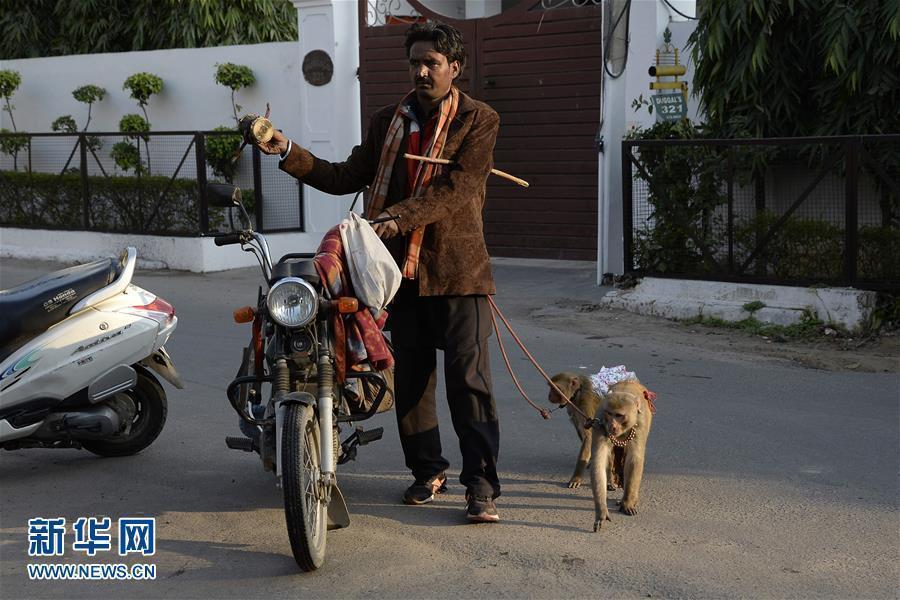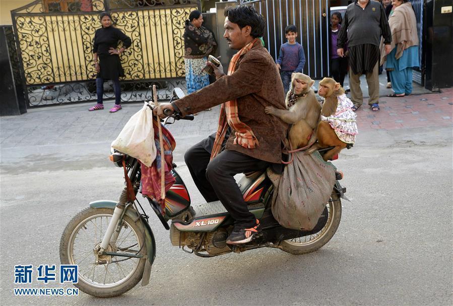 12月25日,在印度贾朗达尔,耍猴艺人在表演后带着猴子离开。两只猴子很顺从的坐在卖艺人的摩托车后座上。