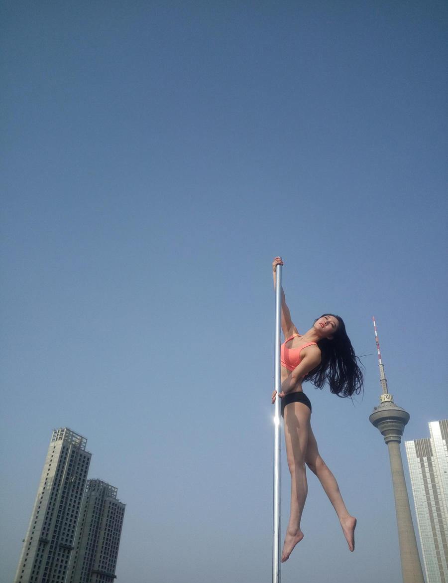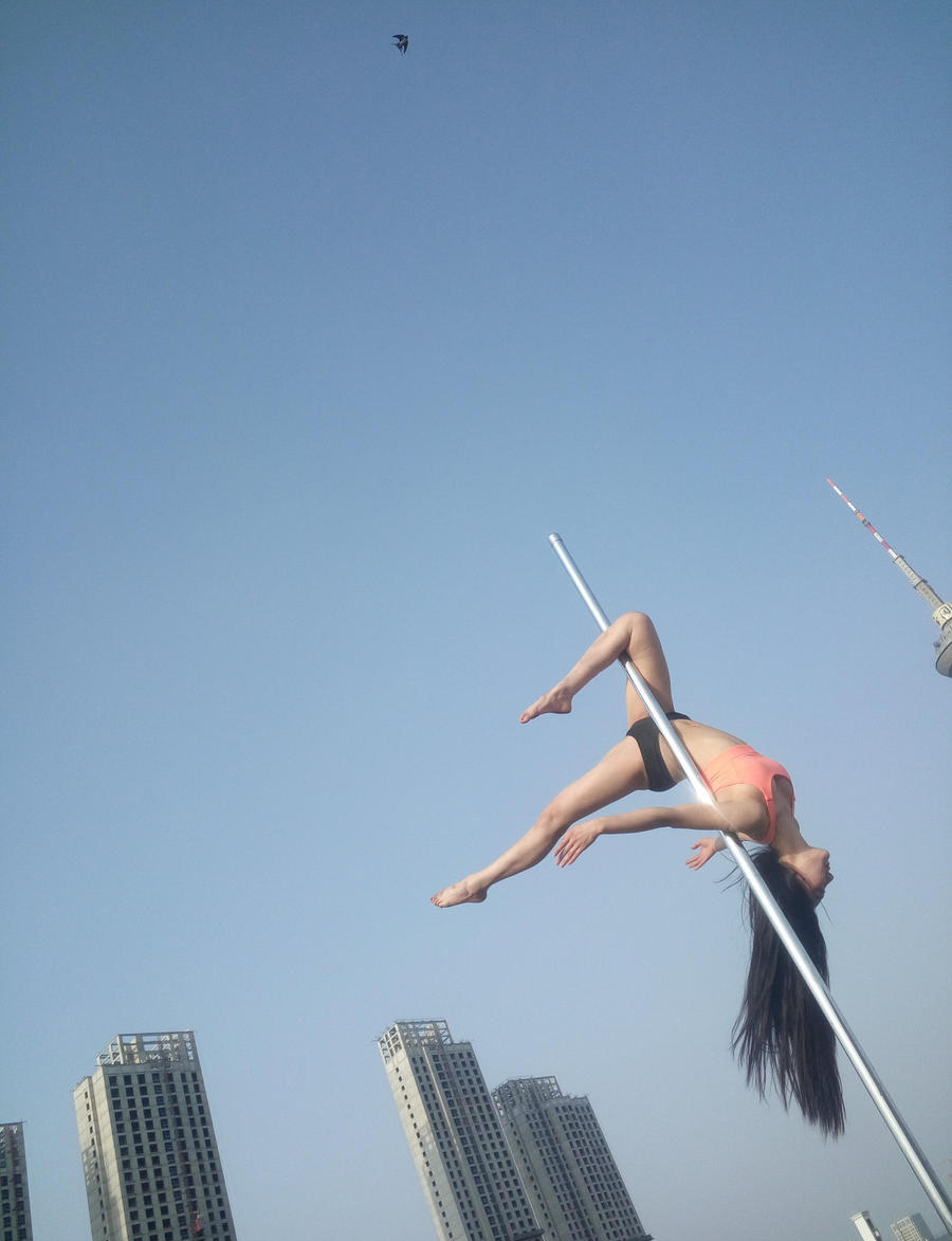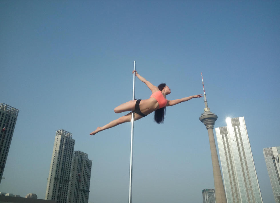 美女宣传钢管舞不遗余力,空中展现高难度动作。