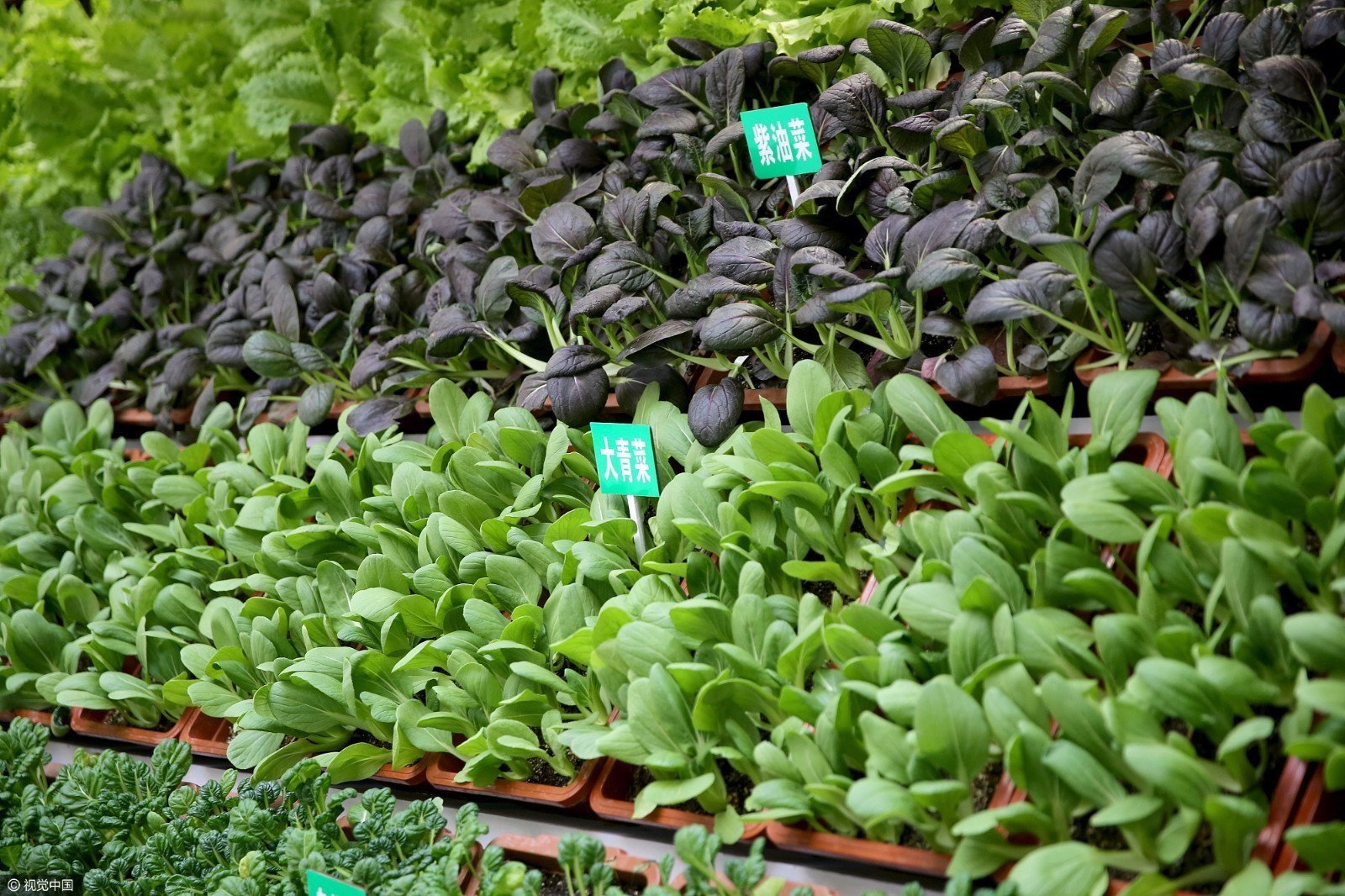 2017年4月17日,郑州,在郑州CBD会展中心, 整整一面墙都是绿色蔬菜,有小白菜、乌塌菜、叶甜菜、紫油菜等,都是用花盆种植的。