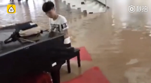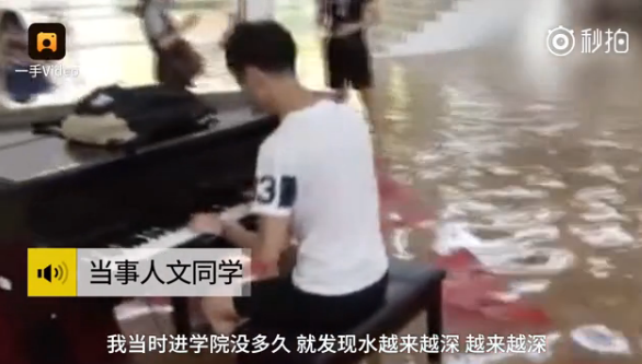 音乐学院大二学生文政森在被淹的学院大厅里看到一架钢琴,心生感触便弹了一首《演艺人》,引来同学围观。
