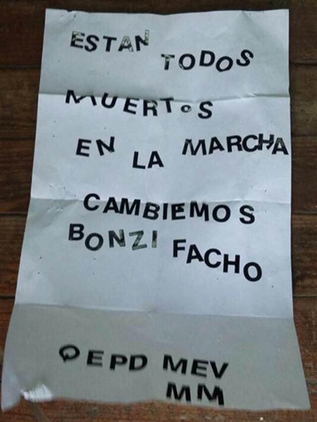 近日在阿根廷执政党联盟"改革阵线联盟"某办公室发现了一封用黑色胶带拼接的匿名恐吓信。其中向总统马克里和布宜诺斯艾利斯省省长比达尔都发出了死亡威胁。