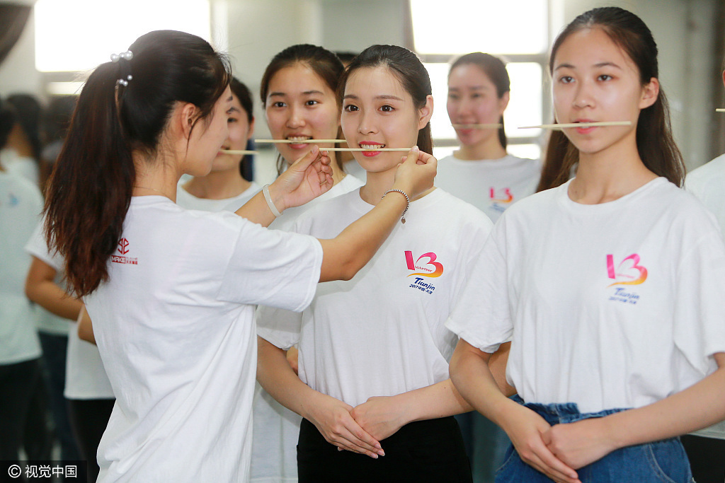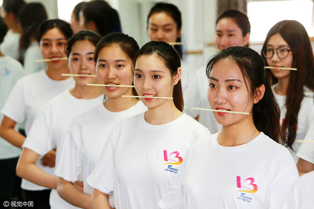 2017年5月8日,天津,20名全运会礼仪志愿者来到舞蹈教室,利用午休时间练站姿,展笑容。礼仪志愿者们咬起筷子,对着镜子练习。