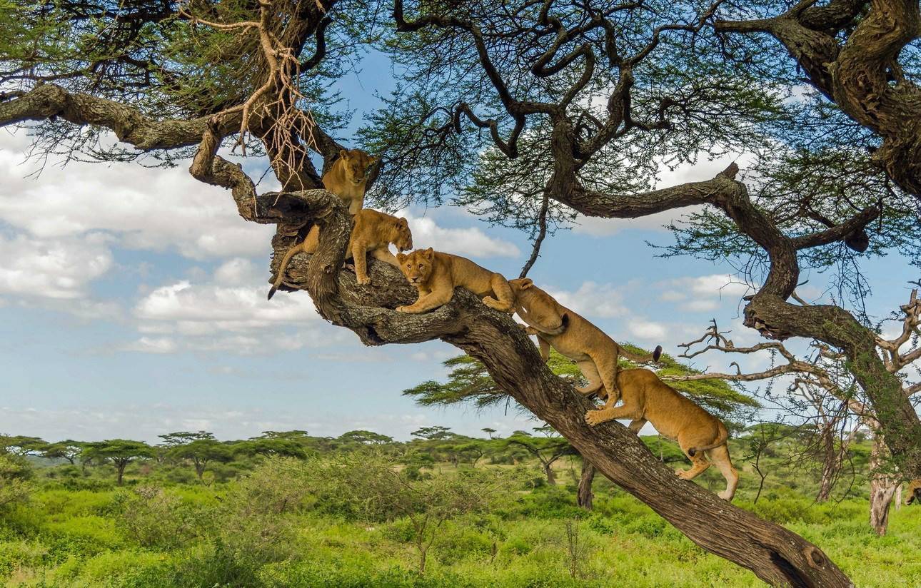 更有趣的是,这些狮子先是在不同的树枝上小憩,最后竟都排着队爬上了一根树枝。
