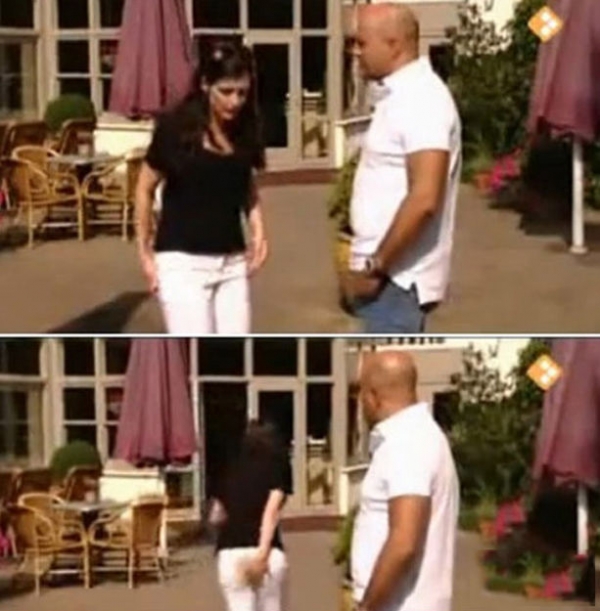2010年2月,荷兰一位女记者居然在直播现场访问途中,突然拉肚子,喷出大便在白裤子上,整个经过还被电视台全程转播出去,被观众评为电视史上最糗画面。图为女记者在直播中拉大便在裤子上。