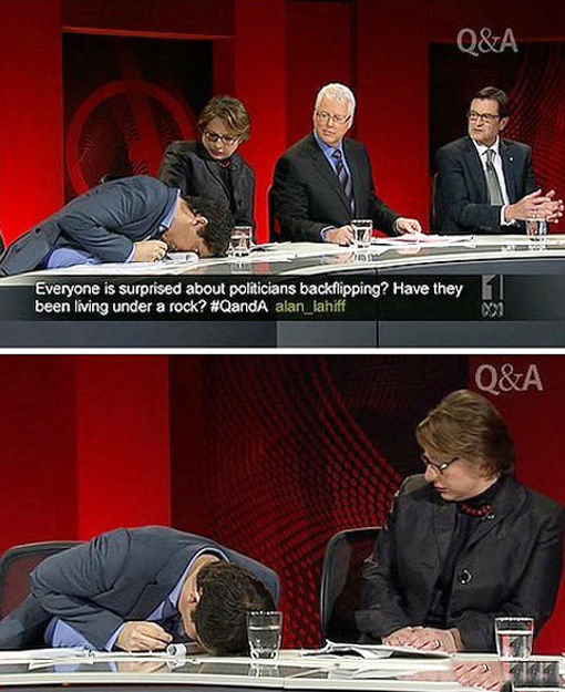 2012年7月,在澳大利亚广播电台直播的“问与答”(Q&A)节目中,来自同性恋活动团体的一位嘉宾突然晕倒在桌子上,不省人事。而坐他旁边的一位女议员不仅没有帮助,而是冷淡地打量,受到很多观众的批评。图为嘉宾晕倒,在旁的女议员冷漠对待。