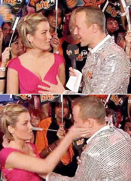 2009年2月,一名德国电视男主持人在电视直播中“袭击”女同事胸部,他因此遭女同事扇耳光。但该男主持认为:“真正的丑闻是她打了我的耳光,而不是我的摸胸行为。”图为男主持人“袭击”女同事。