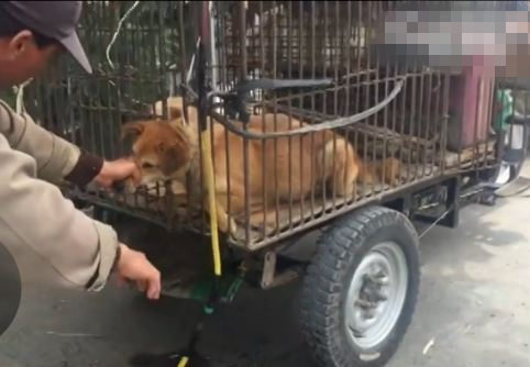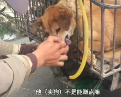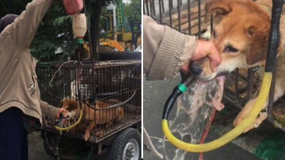 6月9日,在国道河南省偃师市高龙镇火神凹段,一名狗贩子用专用工具给狗灌水,他为了增加重量多赚钱,用管子往狗嘴里灌水,狗被灌得吐水,小贩仍不罢手。