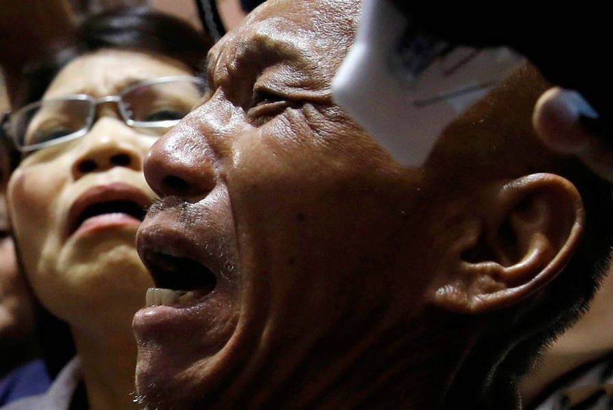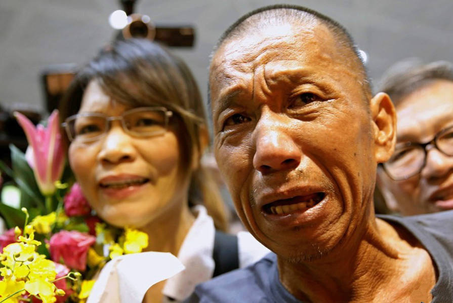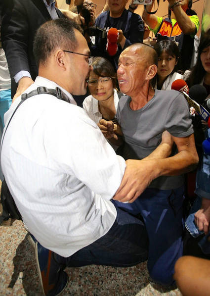 10月26日,遭索马里海盗挟持近5年的阿曼籍“Naham3号”渔船台湾籍轮机长沈瑞章从广州搭机返台。在台北桃园机场,沈瑞章走进入境大厅后,看到接机的船长钟徽德的儿子,再度泪流满面,下跪感谢。
