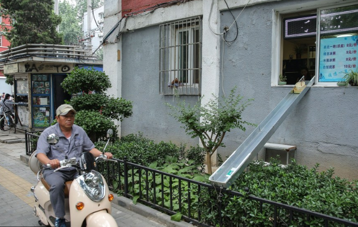 住户窗外设滑梯卖凉皮 行人扫码支付后取货_北京时间