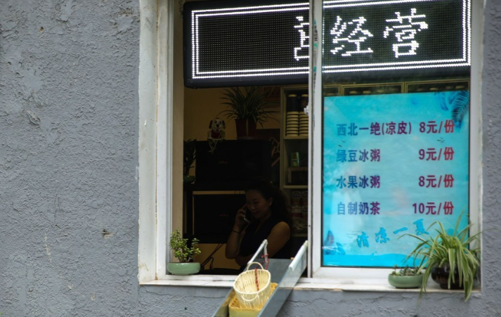上面贴有二维码,行人可扫码支付,从窗内购买凉皮、冰粥等,通过一编织篮取货。