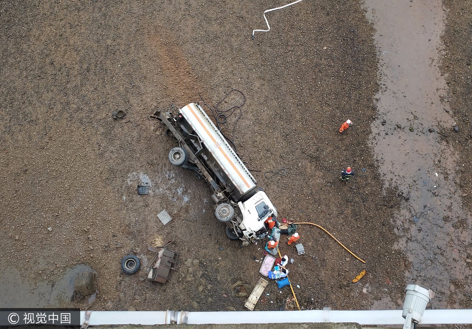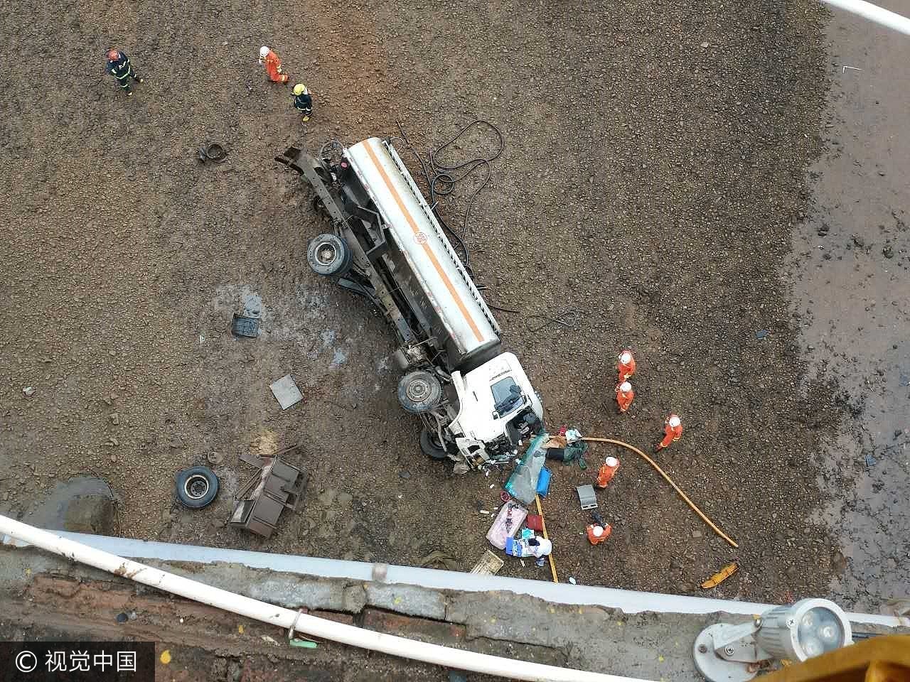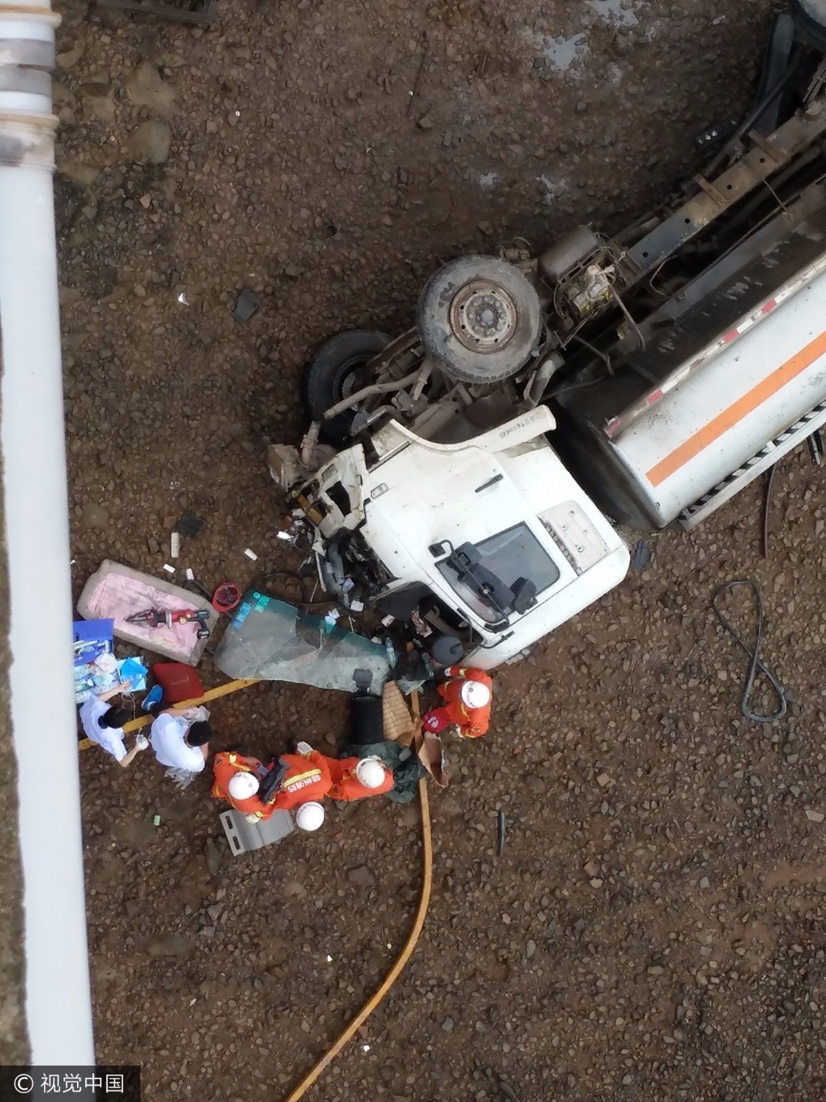 2017年06月02日,江西省赣县梅林大桥,一辆重型罐式货车失控撞毁防护栏后侧翻至桥下,消防官兵和医务人员正在紧急施救。