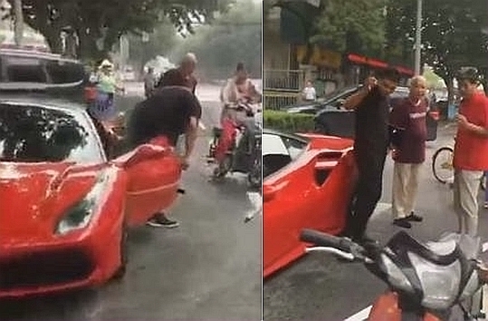在上海118广场附近,有一辆浙江牌照的法拉利被一骑电动车的碰了一下,一大块漆没了。最后车主说:算了算了。网友戏称这种人活该有钱。