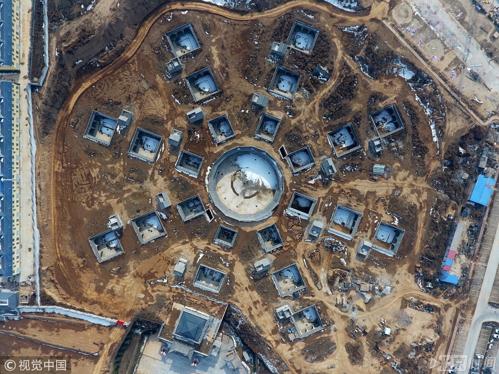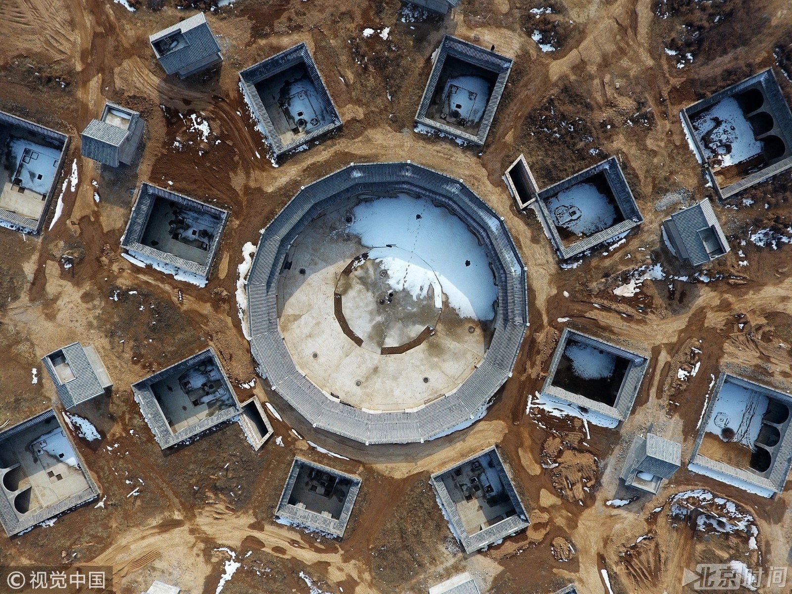 2018年1月21日,河南三门峡,陕州区几座地坑院呈“八卦”形状分布在黄土地上,鸟瞰视角十分新颖。