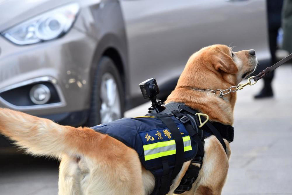 北京警方的警犬在场外佩戴执法记录仪执勤。根据现场警员使用的设备分析,这是北京警方的警犬首次佩戴犬、警用全景VR执法记录仪执勤。