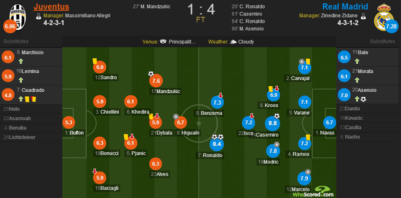 C罗首开纪录,成为第2位3届欧冠决赛破门的球员。伊瓜因助攻曼朱基奇倒钩扳平。