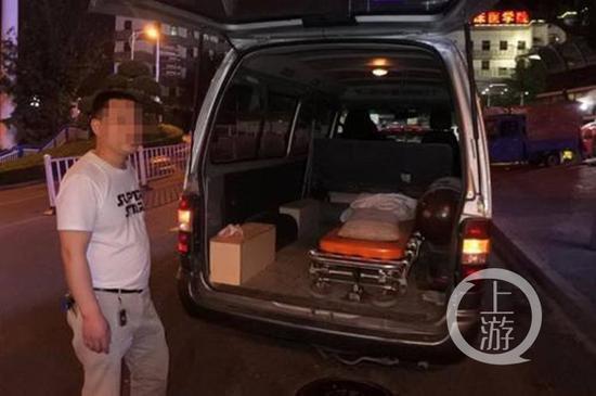 黑色的面包车,里面的座位被拆掉,放上担架、输液架、氧气罐等…咋一看,这有点像是山寨版的救护车。