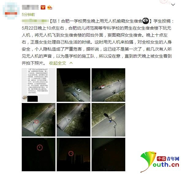 今晨有合肥幼儿师范高等专科学校女生向中国青年网反映,称学校夜晚有男生操纵无人机偷窥女生宿舍,引发女生恐慌。