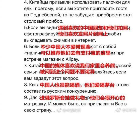 攻略提醒俄罗斯人不要问中国队是否来参赛,多聊中国制造,推荐可以用支付宝的商店,中国人爱喝茅台等。