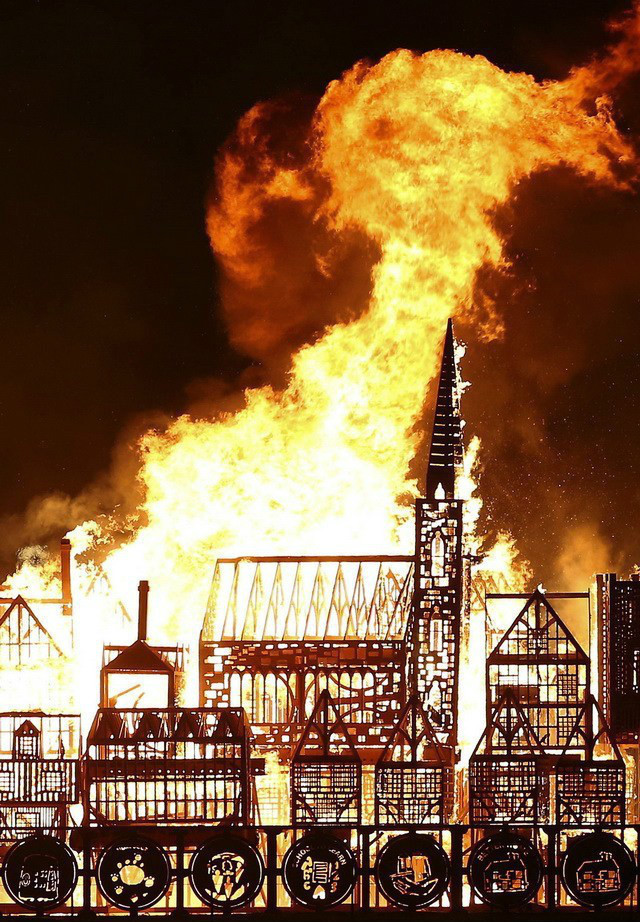 当地时间2016年9月4日,英国伦敦,一座120米长的17世纪伦敦的模型在泰晤士河上被烧毁,纪念伦敦大火350周年。
