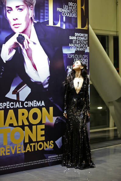 期间,她一袭深V领亮片长礼服秀美胸,多名助理随行伺候,途中遇自己的偶像美国著名女演员莎朗-斯通的杂志广告灯箱牌,兴致大发,狂摆POSE驻足合影,还特意嘟嘴卖萌,妩媚献吻。