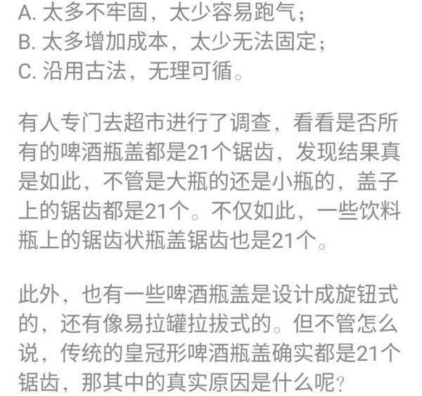 啤酒瓶盖设计成21个锯齿并不是事先按照什么原理设计好的,而是一次次实验之后得出的结果。而这个实验竟然是和开瓶器有关。