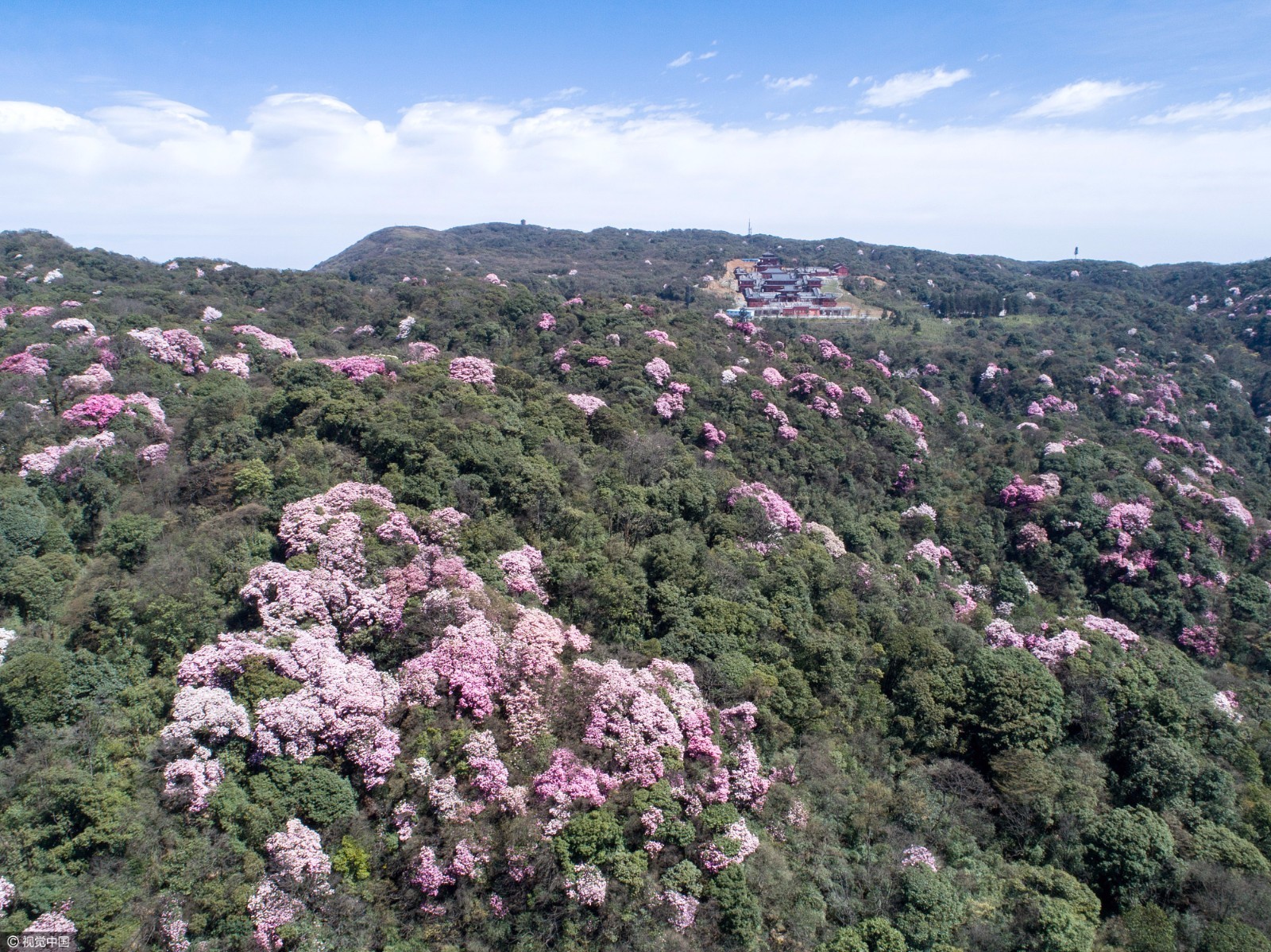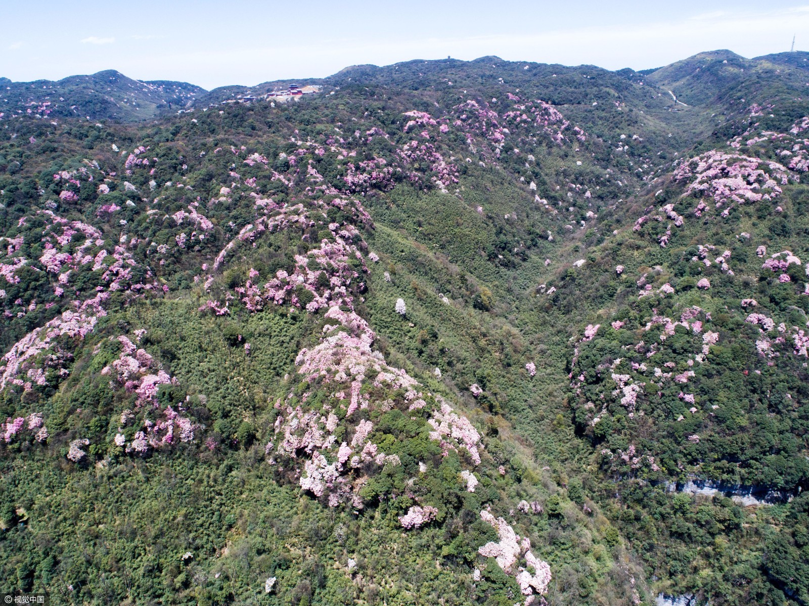 2017年4月18日,航拍重庆金佛山上盛开着的漫山遍野的野生杜鹃花。每年4月中下旬到5月下旬是国家级风景名胜区金佛山一年中最美的季节。