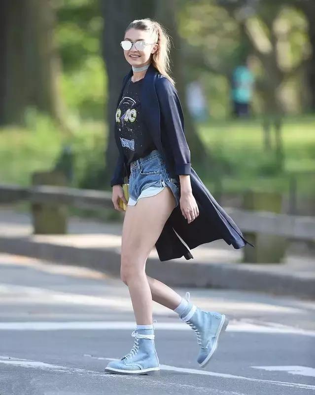 gigi偏爱亮面太阳镜,多一份青春活力,搭配choker更添性感,静谧蓝马丁靴与choker颜色一致,清新十足,露裤袋的牛仔短裤时髦清爽。