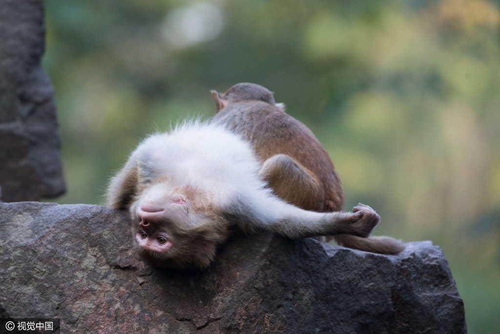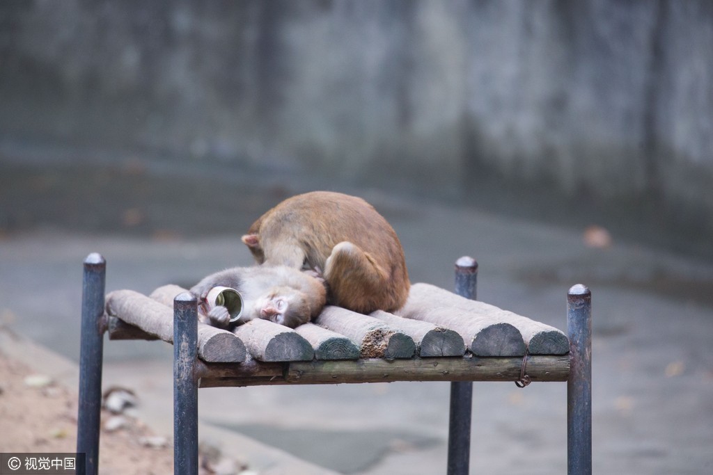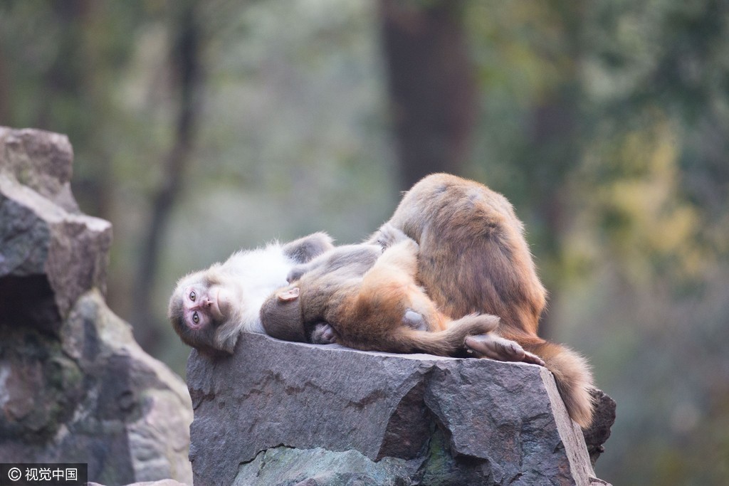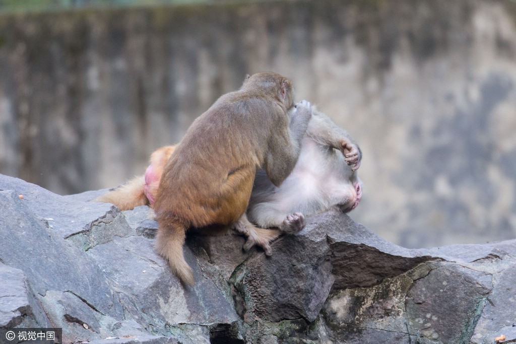 2016年11月18日,浙江省杭州市,杭州动物园猴山,猴子之间互相拨弄身上的毛,看起来好像是在给同伴抓虱子。