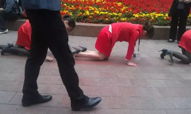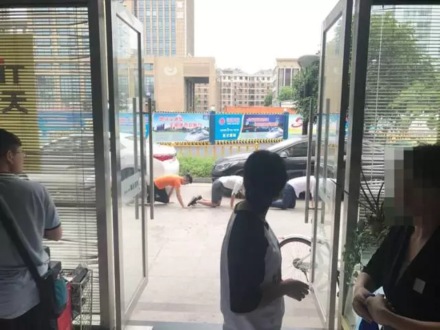 从现场照片来看,跪爬者有10来个人,全是小伙,分成两列队伍。此举引来不少人围观。