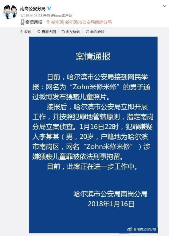 哈尔滨市公安局南岗分局通报其辖区男子猥亵儿童一案。警方表示,目前该男子涉嫌猥亵儿童,被刑事拘留。