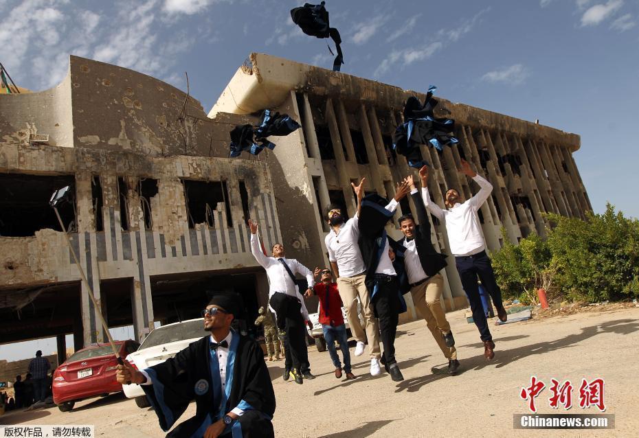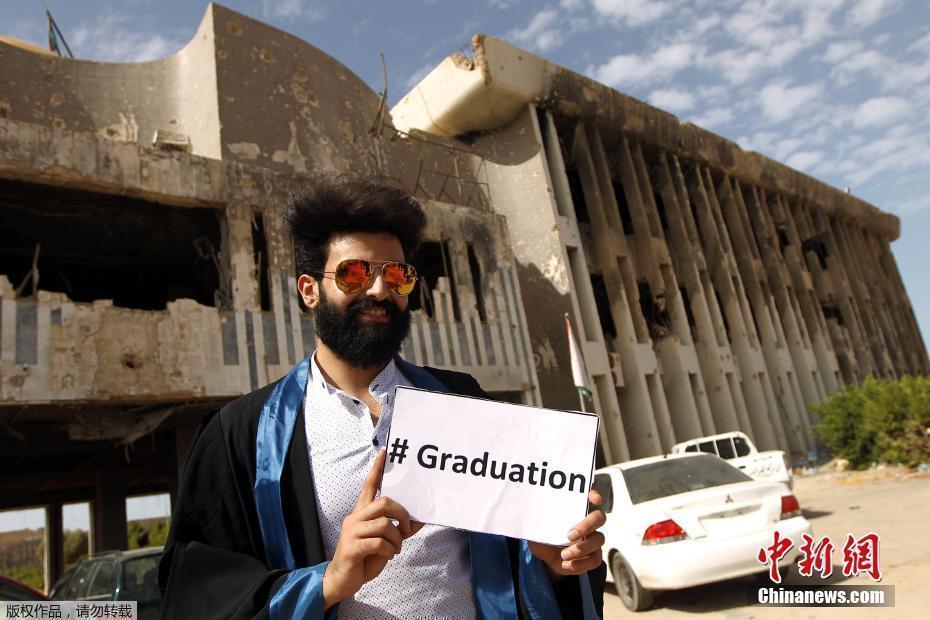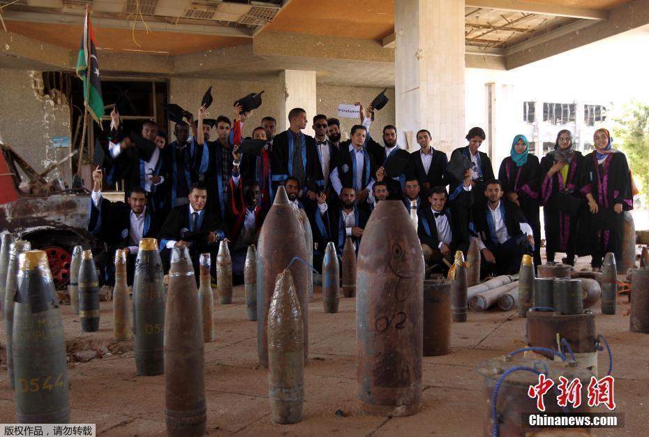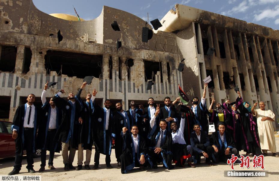 当地时间2016年10月24日,利比亚班加西,班加西大学化学工程专业的学生在战火毁坏的教学楼前拍毕业照。