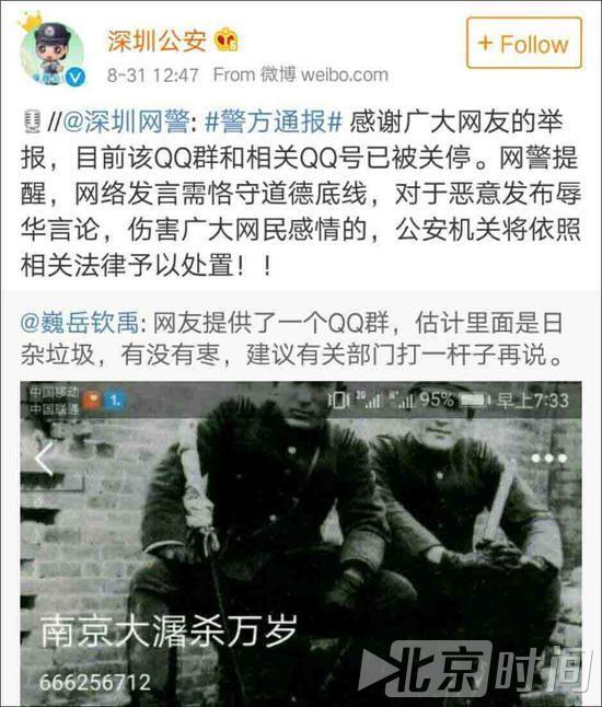 8月31日,有网友在微博上爆料称,发现一个名为“南京大屠杀万岁”的QQ群。群介绍声称,该群是为了“缅怀在战争中牺牲的日本士兵”而建。