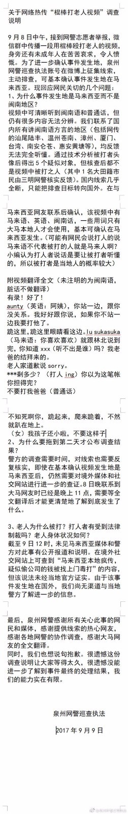 视频中一个年轻人持棍棒殴打老人,旁边还有未成年人在苦苦哀求,令人心痛。9月9日,经福建泉州网警多方求证,视频发生发生在马来西亚。