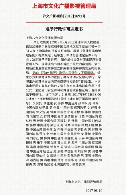 上海市文化广播影视管理局审批文件表示因为“歌词内容低俗”的原因禁止蔡依林的《Play 我呸》在9月3日的商演上演唱。