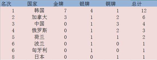 北京时间3月19日,2018年短道速滑世锦赛在加拿大蒙特利尔结束全部比赛,缺少主力参赛的中国队共取得1银3铜的成绩位列奖牌榜的第三位。韩国队以7金4银1铜的成绩高居榜首,加拿大队以3金1银2铜的成绩位列第二。