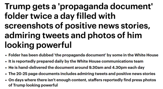 这个文件被一些白宫工作人员隐秘地戏称为“宣传文件”,由特朗普的通讯团队每天负责准备。