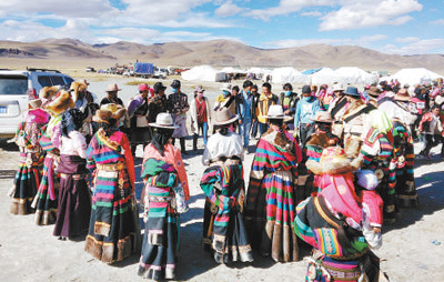 9月26日,在羌塘草原腹地的西藏措勤县磁石乡与尼玛县军仓乡相邻的物玛湖旁,以家庭为单位的藏族牧民群众,在草场上一边割草一边唱歌,悠长的调子久久回荡。
