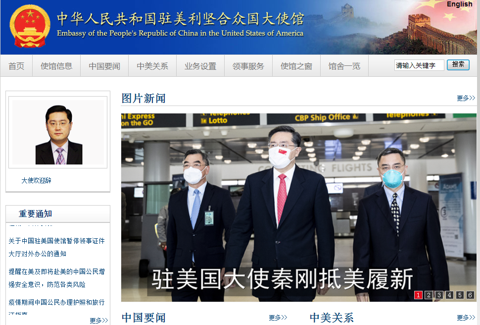 根据中国驻美国大使馆消息,2021年7月28日,中华人民共和国新任驻美利坚合众国特命全权大使秦刚抵达美国履新。