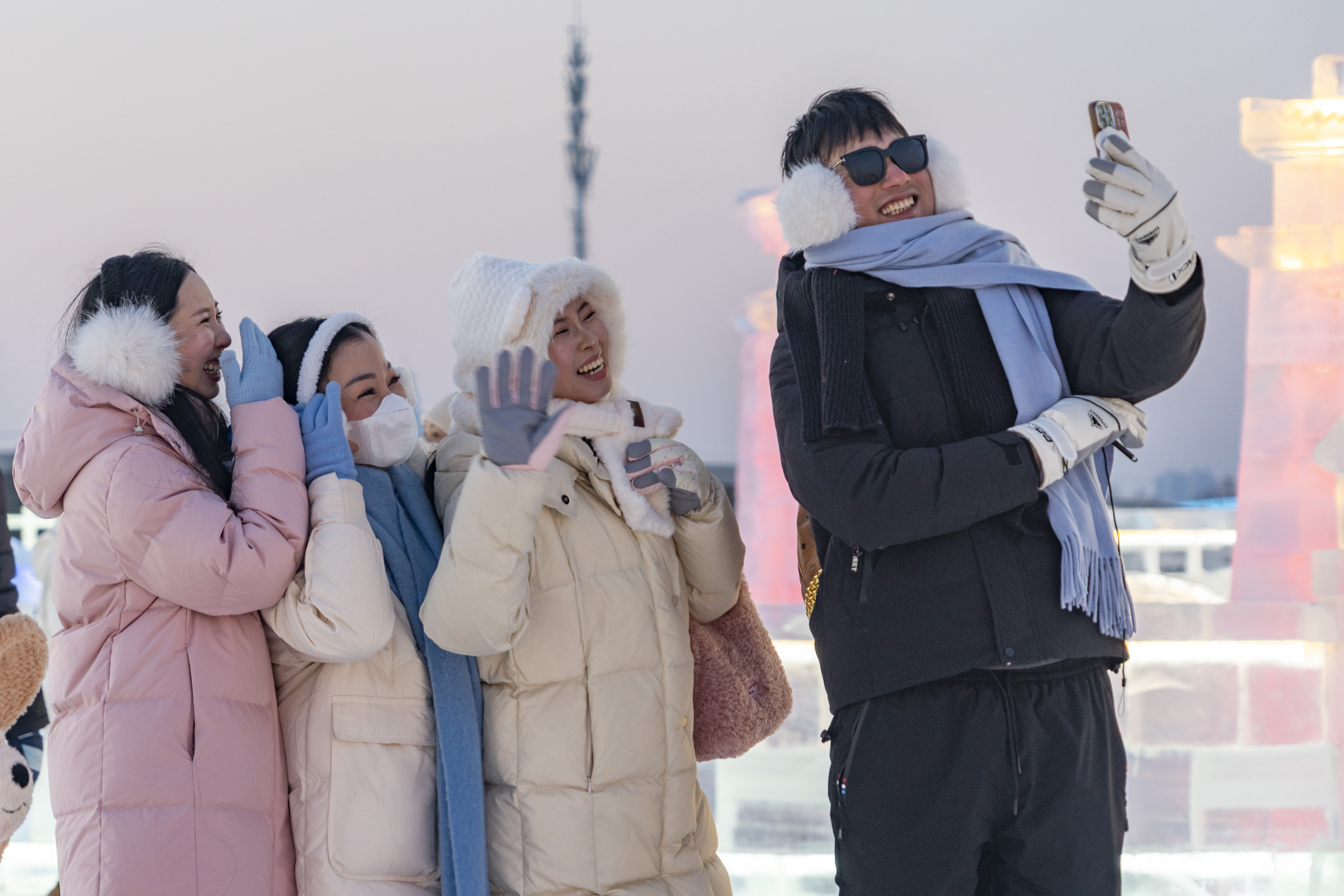 12月17日,游客在哈尔滨冰雪大世界园区内游玩拍照