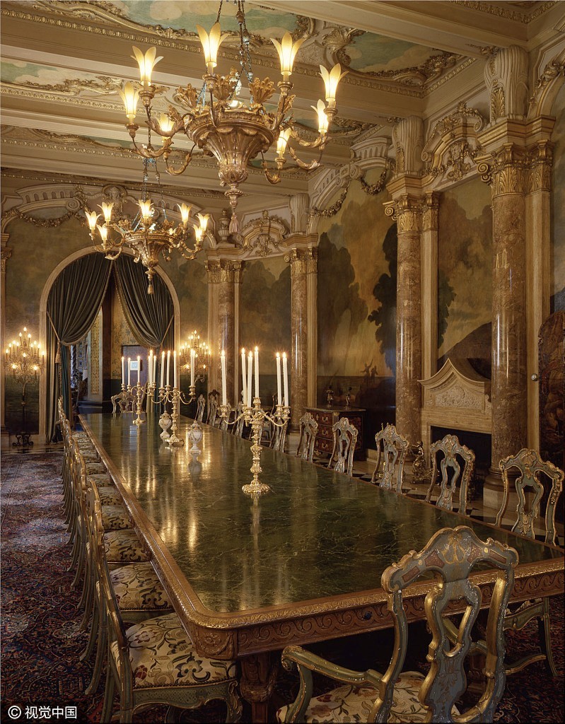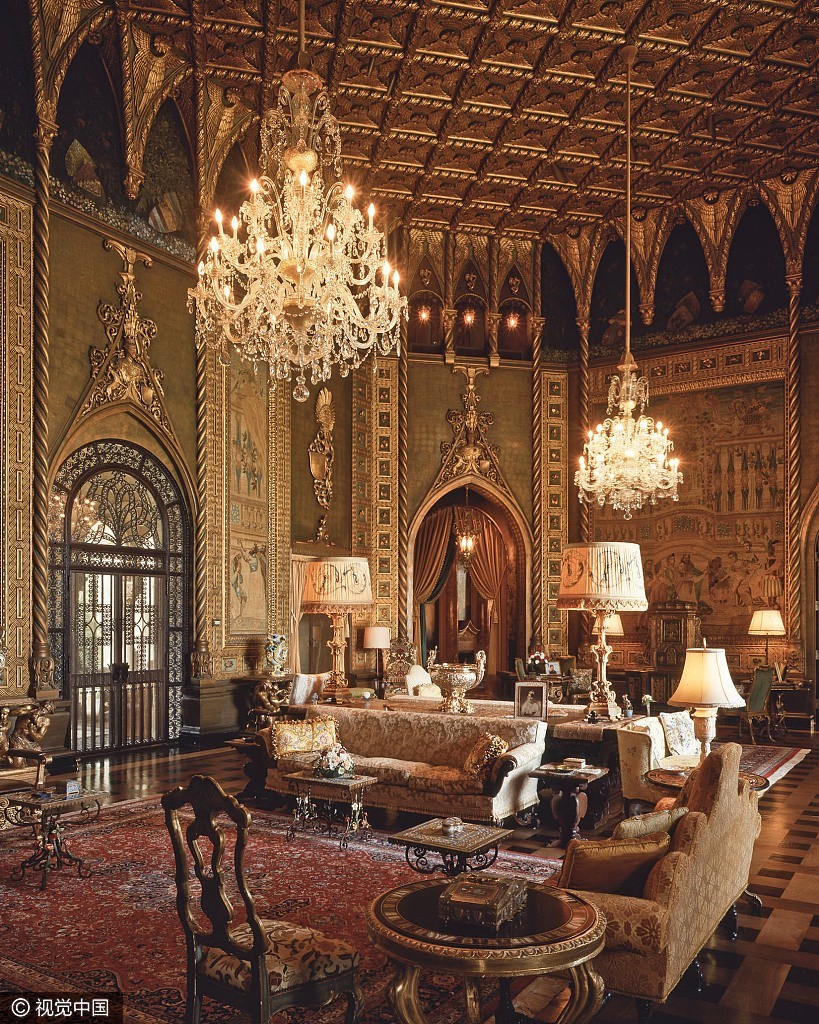 据《纽约时报》报道,海湖庄园内部的一砖一瓦都价值不菲。无论是宏伟大气的威尼斯风格拱门、雕刻有动物形象的外墙,还是仿照佛罗伦萨美第奇宫绘画风格的壁画,带有金色床头板的四柱床,抑或是客厅里的金箔,灯具上的宝石,都让人不禁感叹,海湖庄园不愧为“棕榈滩上的明珠”。