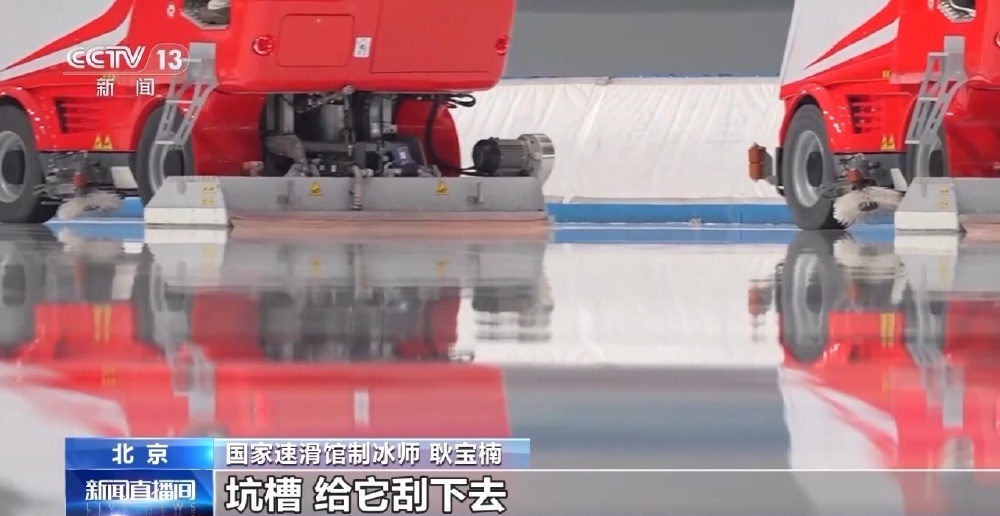 国家速滑馆制冰师 耿宝楠:有些坑槽比较深,它刮不到那么深,就用热水去浇冰面,瞬间冰面就化了,平整了。用浇冰车上冰以后,然后用热水去刺激它,让它这块冰的韧性更强。