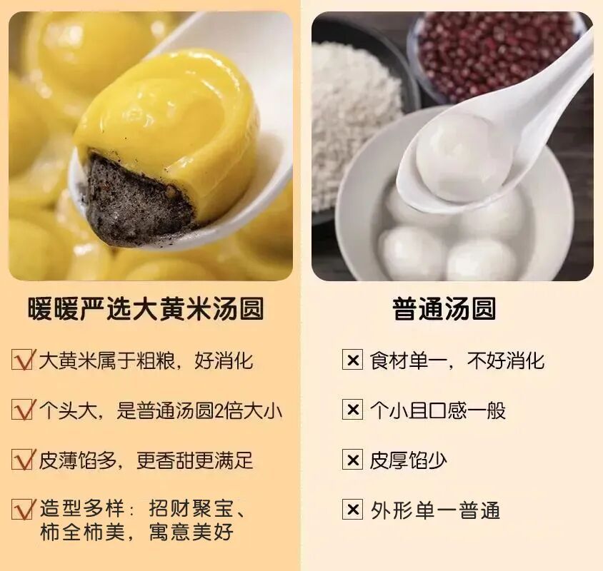 眼尖的朋友肯定已经发现了,大黄米汤圆和招财聚宝汤圆这两款,不同于我们平时常见的的白色汤圆,它的外皮呈黄色。