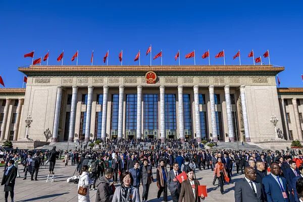 春风拂过长安街,人民大会堂前的红旗与绿意交织成一幅充满希望的图景。