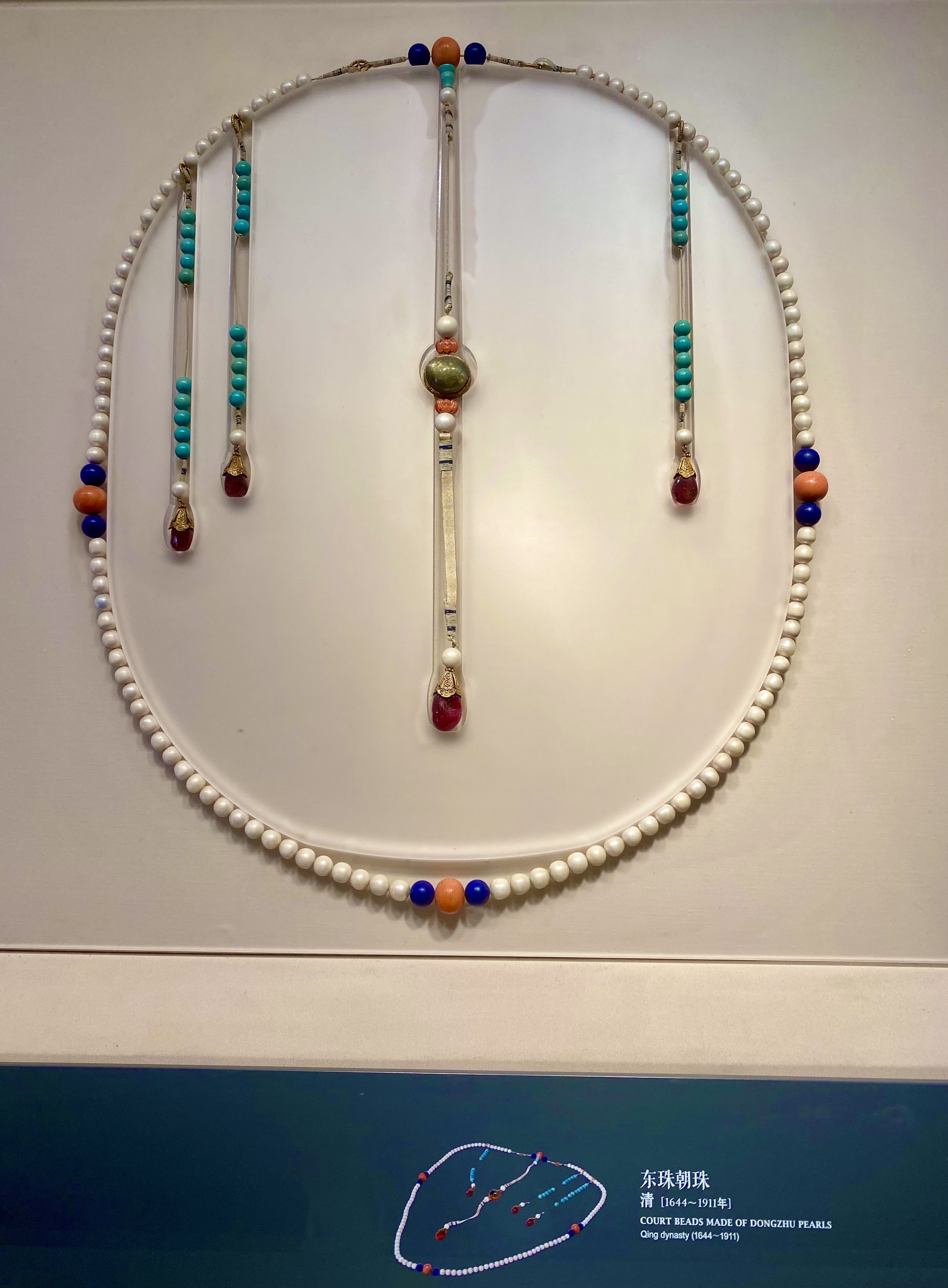 东珠朝珠。每一个都圆润色泽明亮,还配有绿松石、南红、青金石等配饰。是装饰也是身份的象征。