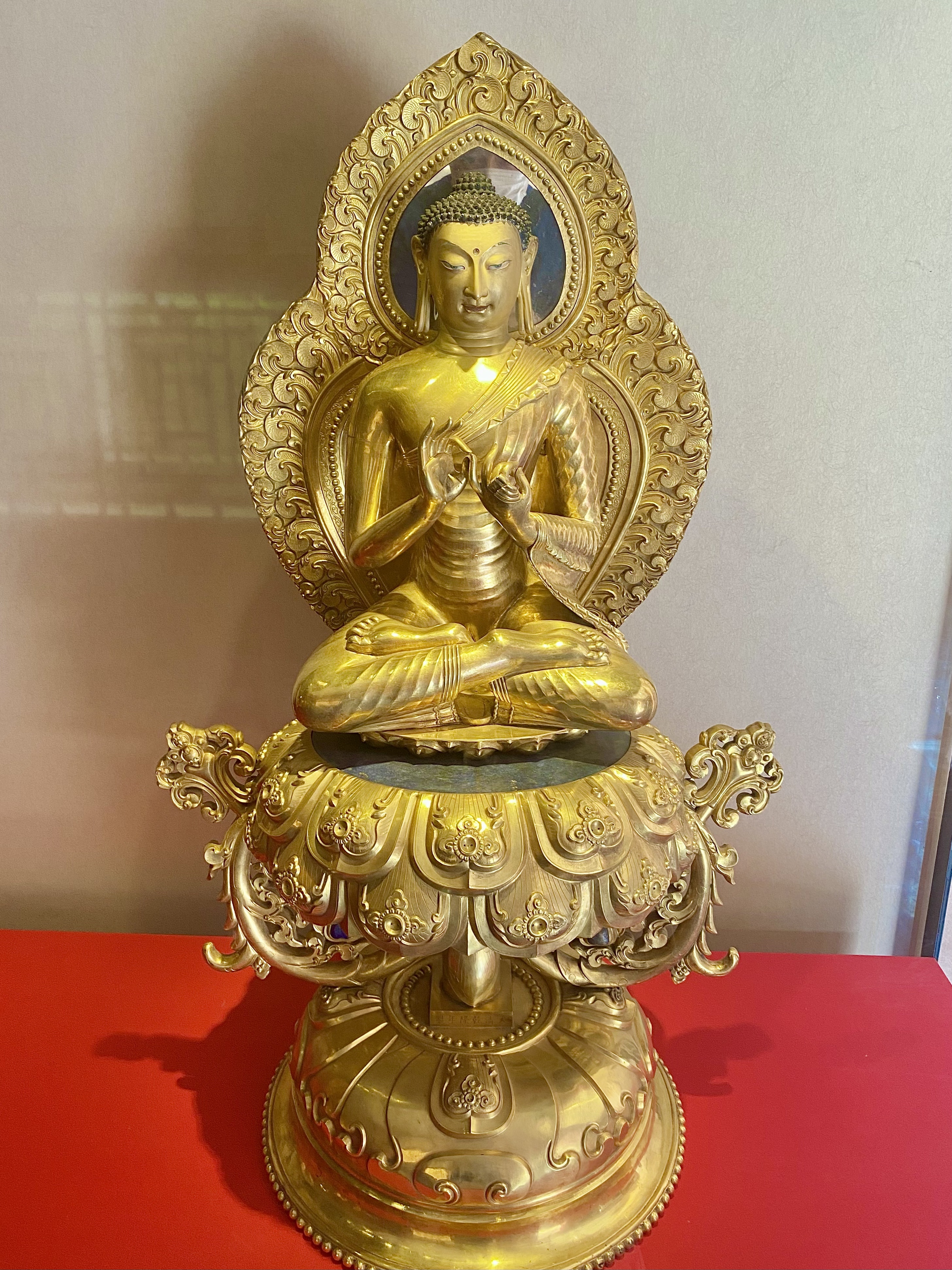 这尊佛像做工精美,和我们平时看到的佛像的相貌有很大的区别。他是当时的皇帝要求工匠按照古印度时期佛陀的样子铸造的,不但相貌奇特,佛祖的莲花座台也是花瓣向下的造型。