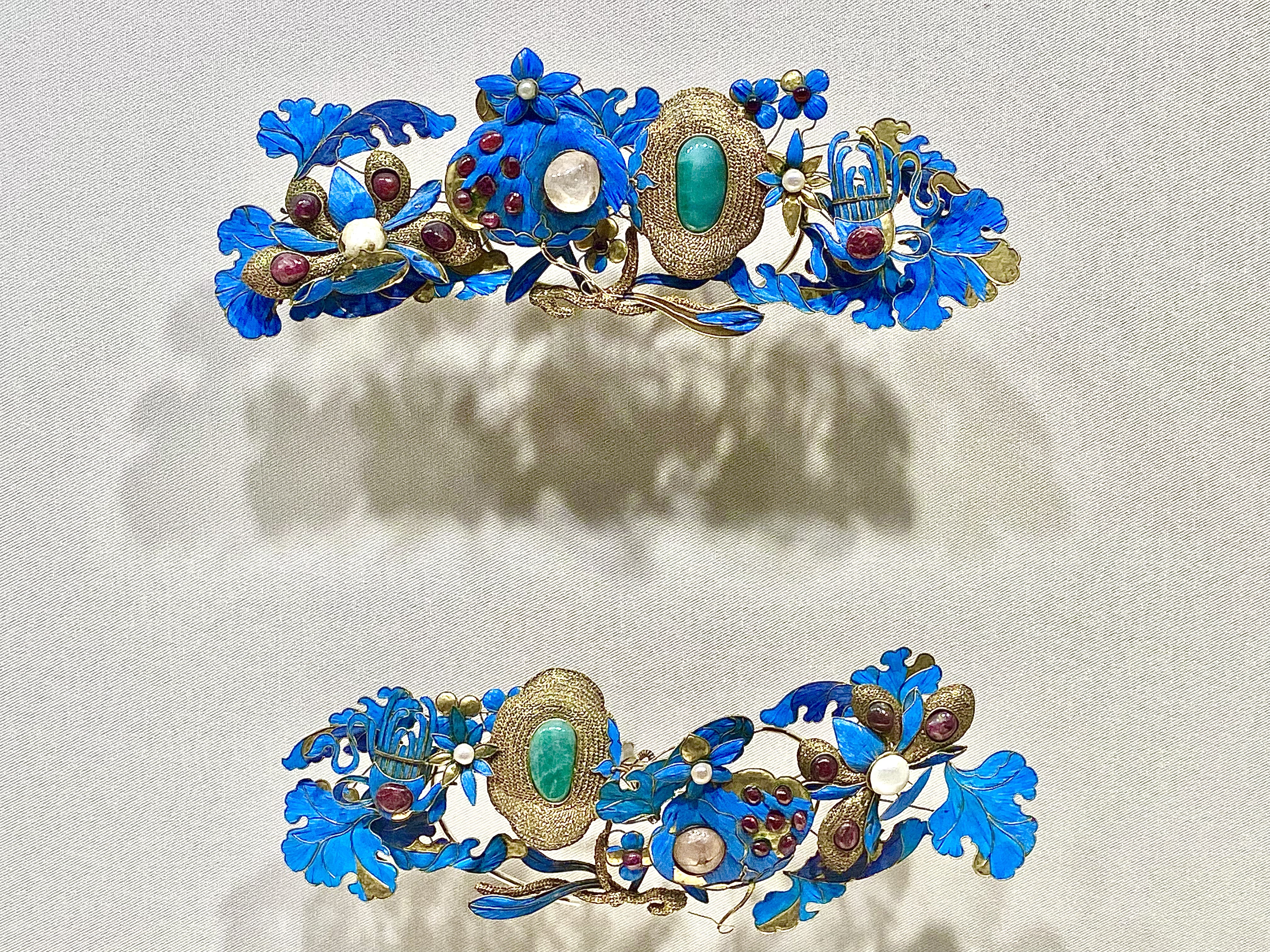 掐丝黄金珍宝美玉都是最普通的存在,穿越时空而越发湛蓝的是凤冠上的点翠工艺。翠鸟用最美的颜色留在了时间里。