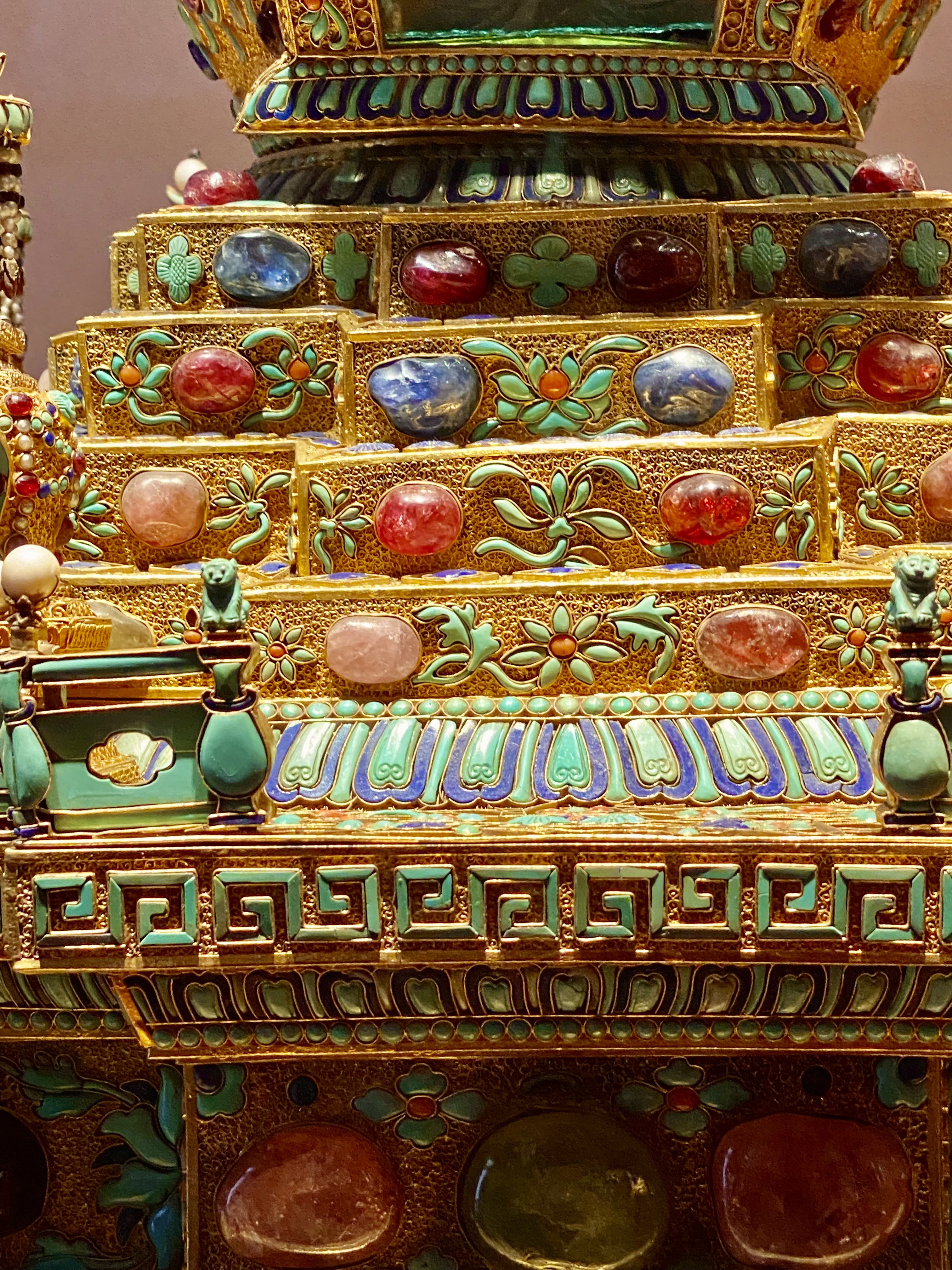 一座宝塔底座的装饰。颗颗色泽鲜艳,糖果的胶质感带着宝石原石最朴素的美。颜色搭配鲜艳跳跃,一眼望去非常舒服!