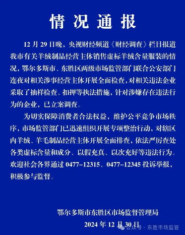 通报称,针对央视财经频道《财经调查》栏目报道该市有关羊绒制品经营主体销售虚标羊绒含量服装的情况,鄂尔多斯市、东胜区两级市场监管部门联合公安部门连夜对相关涉事经营主体开展全面检查,对相关违法企业采取了抽样检查、扣押等执法措施,针对涉嫌存在违法行为的企业,已立案调查。东胜区市场监督管理局表示,已迅速组织开展专项整治行动,对辖区内羊绒、羊毛制品经营主体开展全面排查,依法严厉查处各类虚标含量和成分、以假充真、以次充好等违法行为。